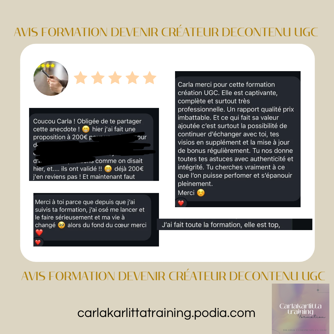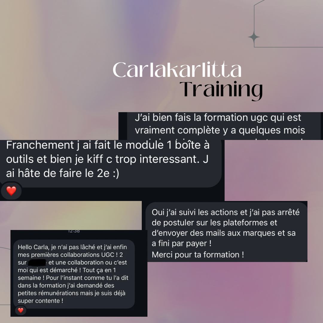 En résumé, la formation en ligne avec Carla est une expérience exceptionnelle que je recommande vivement à tous ceux qui cherchent à se lancer dans le contenu UGC 🚀. Merci, Carla, pour cette opportunité transformative ! 🙏"