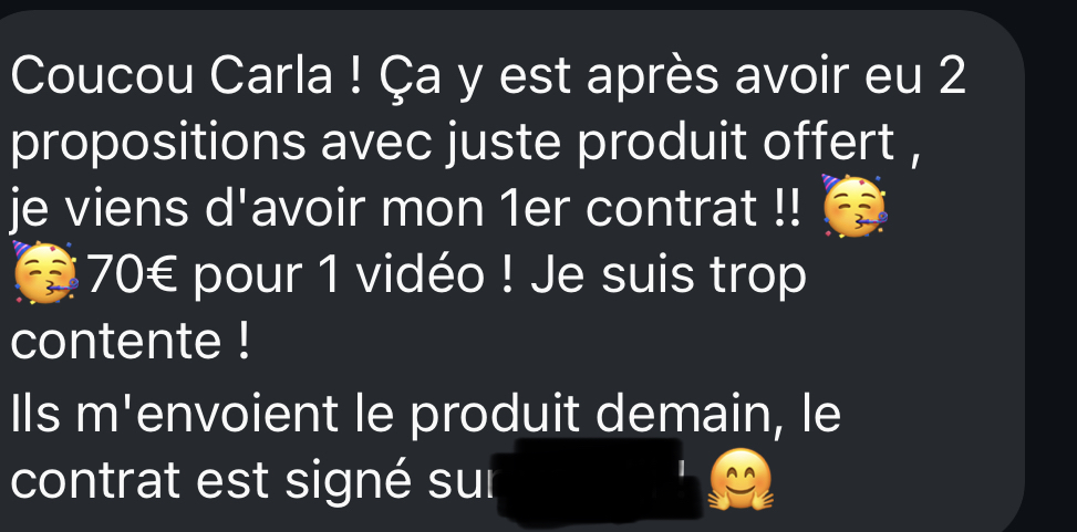 Je partage toujours des choses que j'ai faites et qui ont marché, je ne vends pas des formations, je vends tous mes conseils, mes clés de ce que j'ai fait concrètement pour que ça marche, j'expérimente avant de partager ce qui mène au succès. Je gagne jusqu'à plus de 2 500€ par mois uniquement avec la création de contenu, sans démarcher, sans chercher à développer, simplement avec des contrats qui me sont proposés via les agences dans lesquelles je suis inscrite et que je te partage.
