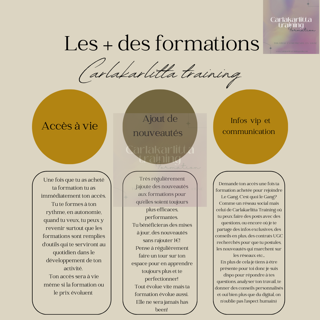 Parce que je n’ai pas envie de te priver dès que j’ai des nouvelles idées, que j’essaye des choses qui marchent de te les partager pour constamment évoluer et se perfectionner pour devenir les meilleurs créateurs de contenus. Cette rubrique hébergera des nouvelles vidéos ou documents de temps en temps alors même si tu as terminé ta formation pense à venir y jeter un œil.
